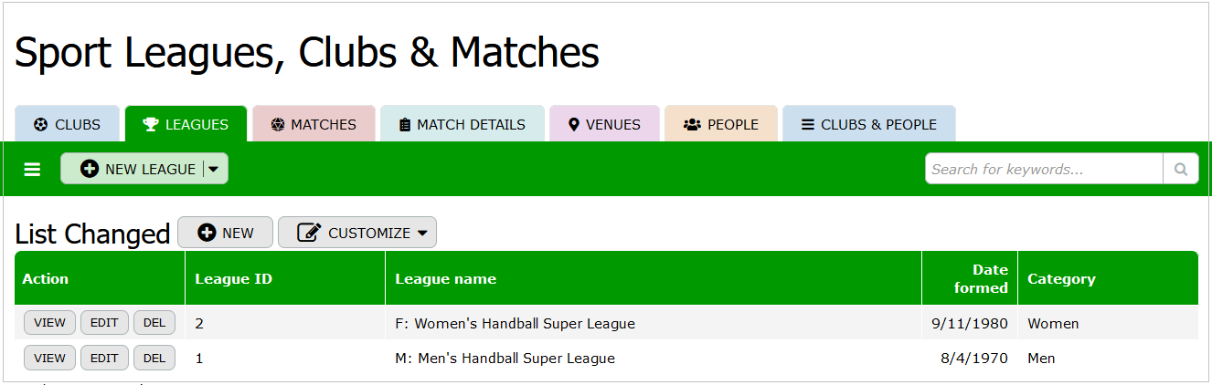 The Leagues table tracks information about various sports leagues, including their names, formation dates, and categories. This table helps in managing and organizing different leagues, providing a clear overview of the leagues' structure and their operational timelines.