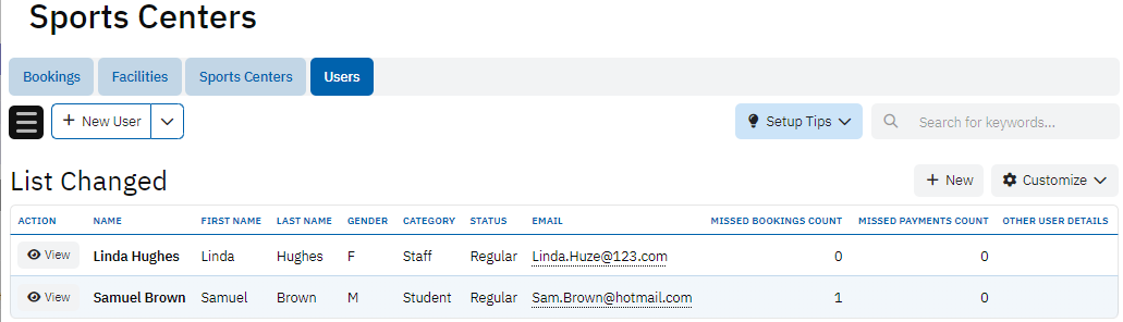 The Users table tracks all individuals or groups using the sports facilities. It records each user's Name, Gender, and Category (which may denote membership type or user classification), as well as their Status (e.g., active, suspended). Additionally, it tracks important data like Missed Bookings Count and Missed Payments Count, helping manage user behavior and ensuring that habitual no-shows or late payments are properly addressed. This table is crucial for maintaining user records and ensuring that each user’s history is accessible for management purposes.