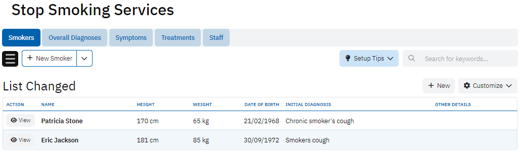 The Smokers table contains detailed information about the patients. It includes the smoker’s Name, Height, Weight, and Date of Birth, along with their Initial Diagnosis and any Other Details. This table serves as the foundation for patient profiles, tracking personal data and medical history necessary for developing tailored treatment plans.