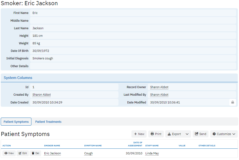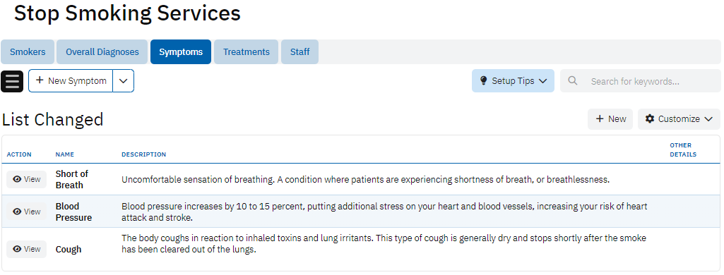 The Symptoms table catalogs potential symptoms smokers may experience. It includes fields such as Name and Description, serving as a reference for patient assessments and making it easier to track common or unique symptoms across multiple patients.