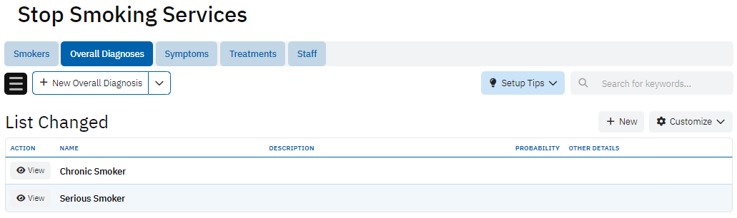 The Overall Diagnoses table holds possible diagnoses that could be relevant to the smoker's health. It stores the Diagnosis Name, a brief Description, and the Probability of each diagnosis. This table helps practitioners evaluate the likelihood of various diagnoses, contributing to more accurate patient assessments.