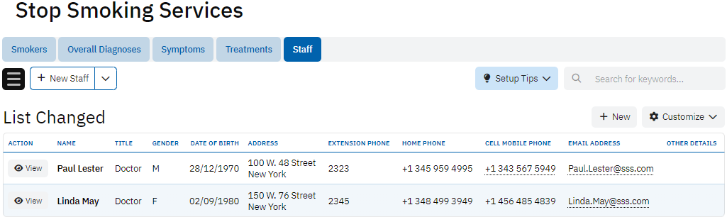 The Staff table records the medical professionals involved in the smoking cessation program. It includes their Name, Title, Contact Information, and other personal details. This table helps manage staff assignments and ensures that each patient is treated by a qualified healthcare professional, keeping a clear record of which staff members are responsible for patient care.