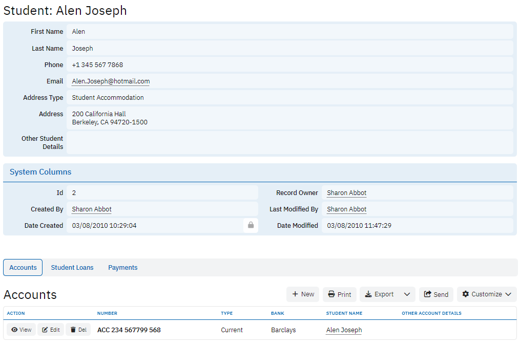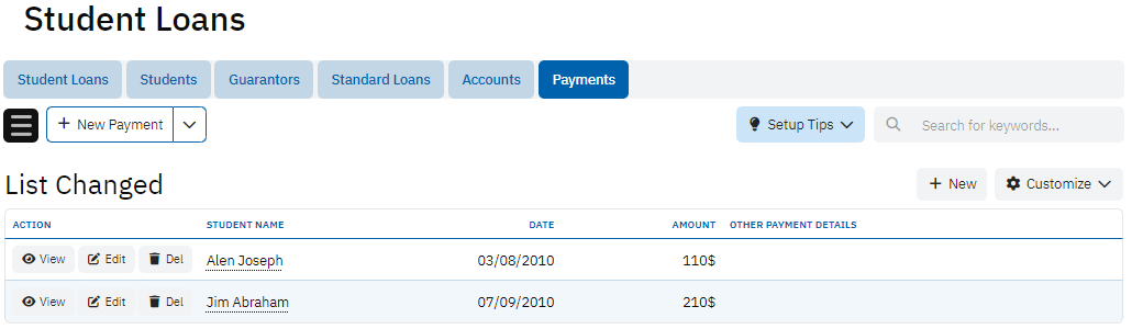 The Payments table tracks individual payments made towards student loans. It includes details such as Payment Date, Amount, and Student Name, offering a clear record of repayments made by students. This table is vital for monitoring loan repayment progress and ensuring that students are meeting their financial commitments.