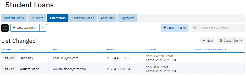 The Guarantors table records details about individuals or organizations acting as guarantors for the loans. It contains information such as First Name, Last Name, Email, Phone, and Address. The guarantor plays a critical role in securing the loan, and this table helps track their information for accountability and communication.