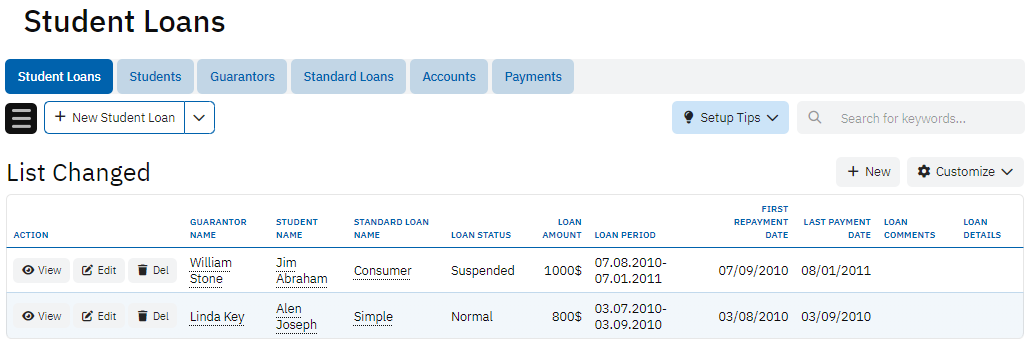 The Student Loans table contains core information about each loan, including the Guarantor Name, Student Name, Loan Status, Loan Amount, Loan Period, and Repayment Dates. This table serves as the main hub for tracking loan progress, from when it was granted to the repayment status, ensuring that both lenders and borrowers can monitor the financial obligations.