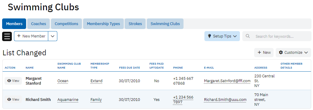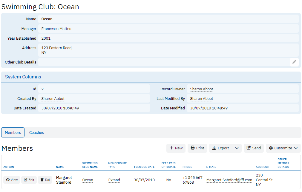 The Members table holds detailed personal information about each club member, such as First Name, Last Name, Club Name, Membership Type, and contact details like Phone and Email. It also tracks the financial status of members, including fields like Fees Due Date and whether their Fees Paid are up to date. This table is central to managing member registrations, ensuring all personal and financial information is easily accessible.