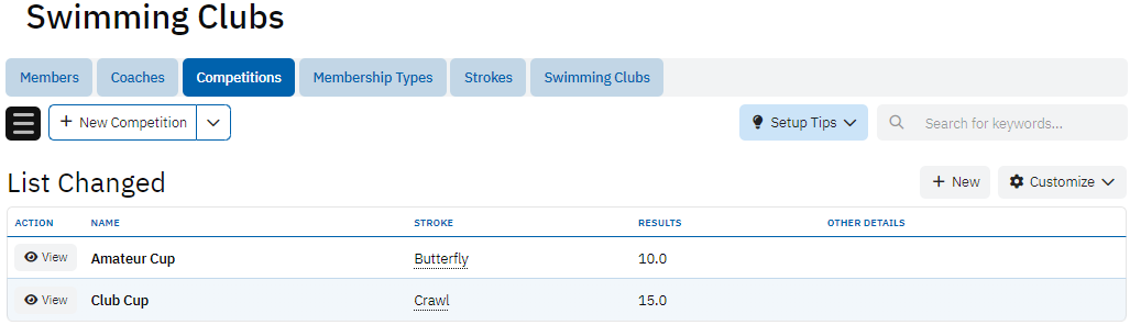 The Competitions table tracks details about swimming competitions, including the Stroke, Results, and any other relevant competition information. It serves as a record of the competitive events in which the club members participate.