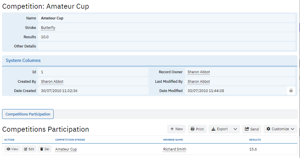 The Competitions Participation table links members to the competitions they’ve participated in, showing fields like Competition Stroke, Member Name, and their Results. It is essential for recording how members performed in various competitions.