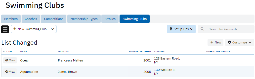 The Swimming Clubs table stores information about each club, including the Manager, Year Established, and Address. This table is vital for identifying the various clubs that members and coaches are associated with and ensuring all club-related information is well-organized.