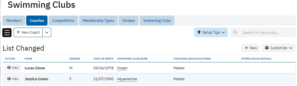 The Coaches table stores information about each coach, including their First Name, Last Name, Gender, Coaching Qualifications, and their assigned Swimming Club. This table helps manage the staff responsible for training and guiding the club members.