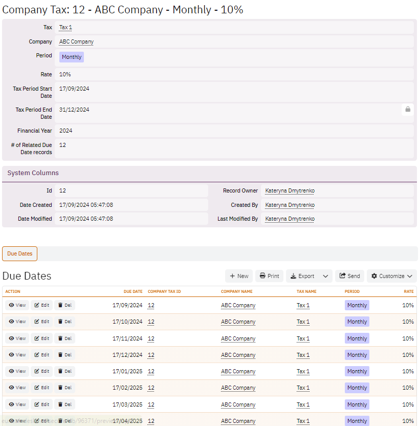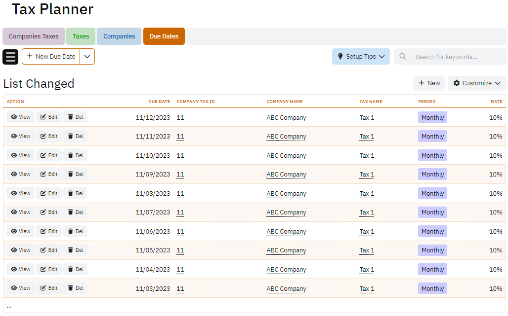 The Due Dates table tracks when specific taxes are due for each company. It includes fields like Due Date, Company Tax Id, Company Name, Tax Name, and Period. This helps companies stay on top of their tax deadlines, ensuring timely payments. The fields Rate lookup and Period lookup are used to reference specific tax rates and periods for accuracy.