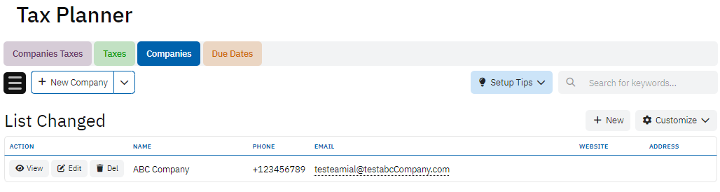 The Companies table contains key information about the businesses subject to taxation. It includes fields like Name, Phone, Email, Website, and Address, serving as a detailed directory of the companies. This table links tax records to the companies they belong to, allowing easy cross-referencing between tax obligations and business entities.