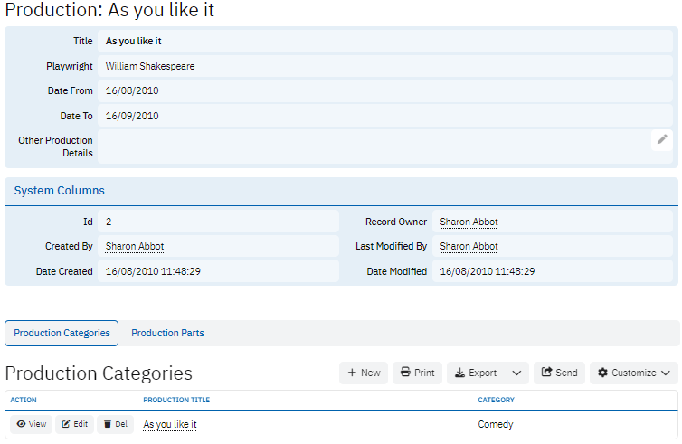 The Productions table contains information about the theater company’s productions, including Title, Playwright, and the production dates (Date From, Date To). This table helps the company keep a log of all the performances they’ve put on, as well as key production details that are relevant for future references or archives.