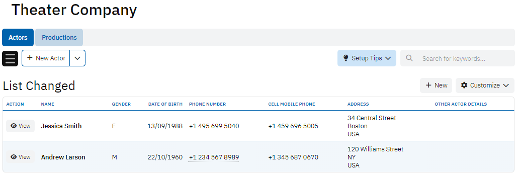 The Actors table stores detailed information about the actors involved in the theater company. It includes personal information such as First Name, Last Name, Gender, Date Of Birth, Phone Number, and Address, along with any other actor-specific details. This table acts as a central registry for all actors, making it easy to manage and track the talent pool of the company.