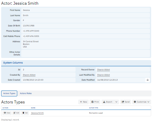 The Actors Roles table links actors to the specific roles they play in productions. It contains fields like Production Part Name, Actor Name, and the dates during which the actor played the role (Date Played From, Date Played To). This table is key for tracking the history of an actor's performances and managing casting records over time.