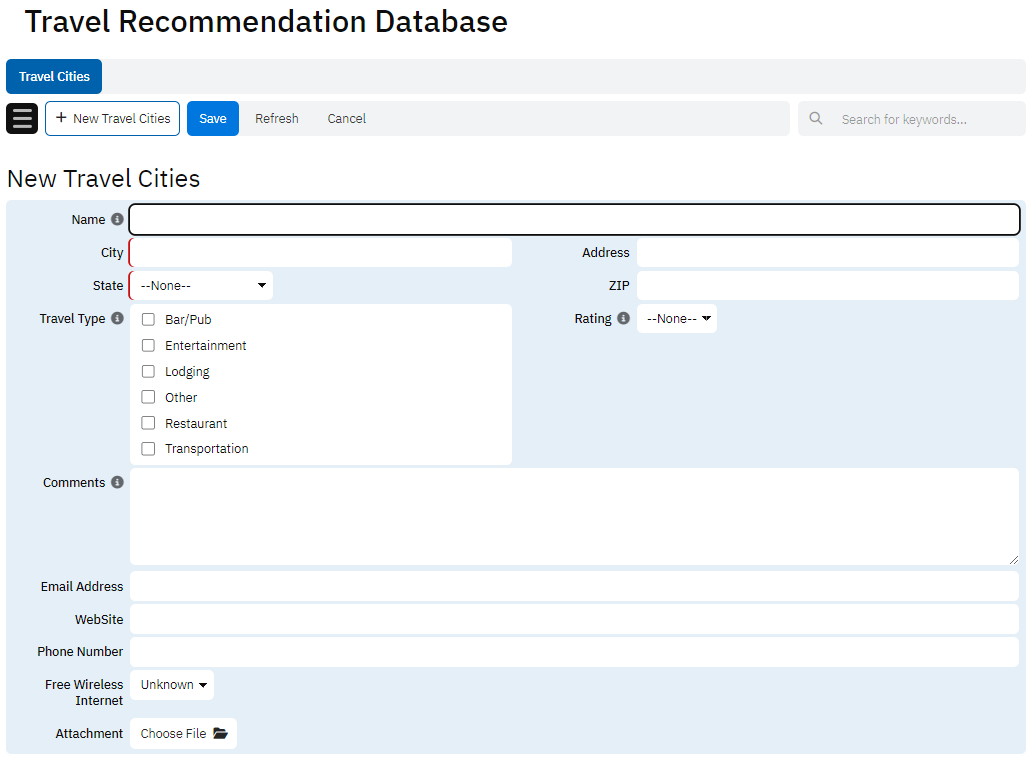 The Travel Cities table is the core of the database, containing important details about different travel destinations. Each record includes the Name of the location, the City, State, and Address to help users pinpoint the exact spot. It also includes practical details like the ZIP code, Phone Number, and Email Address, ensuring travelers can easily contact the location. The Travel Type field indicates whether the destination is suitable for specific types of travel, such as leisure or business, while the Rating and Comments fields offer user-generated feedback on the experience. The table also tracks additional services like Free Wireless Internet, and provides a link to the location's Website for more information. Each record has an Attachment field for any additional resources or documents. The table is organized with unique IDs for each location, and tracks who Created or Last Modified each entry, ensuring all records are current and accurate.