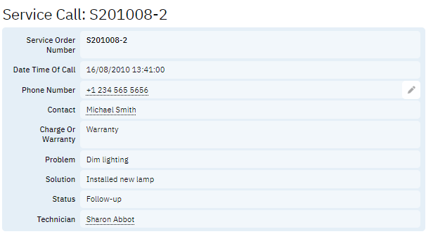 The Service Calls table is the core of the database, logging every service interaction with customers. Key fields include the Service Order Number, Date and Time of Call, Problem, Solution, and Technician. This table tracks the issue from initial contact through to resolution, providing a clear record of what was done and who was involved.