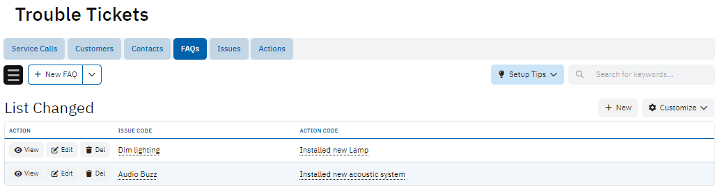The FAQs table provides a list of common issues and actions, identified by Issue Code and Action Code. This table helps support staff quickly find solutions to recurring problems, improving efficiency.