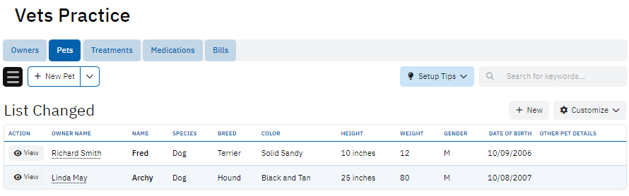 The Pets table tracks each pet's details, including the Owner Name, Species, Breed, Color, Height, Weight, Gender, and Date of Birth. This is crucial for maintaining individual records for each pet and ensuring that the clinic can cater to their specific medical needs.