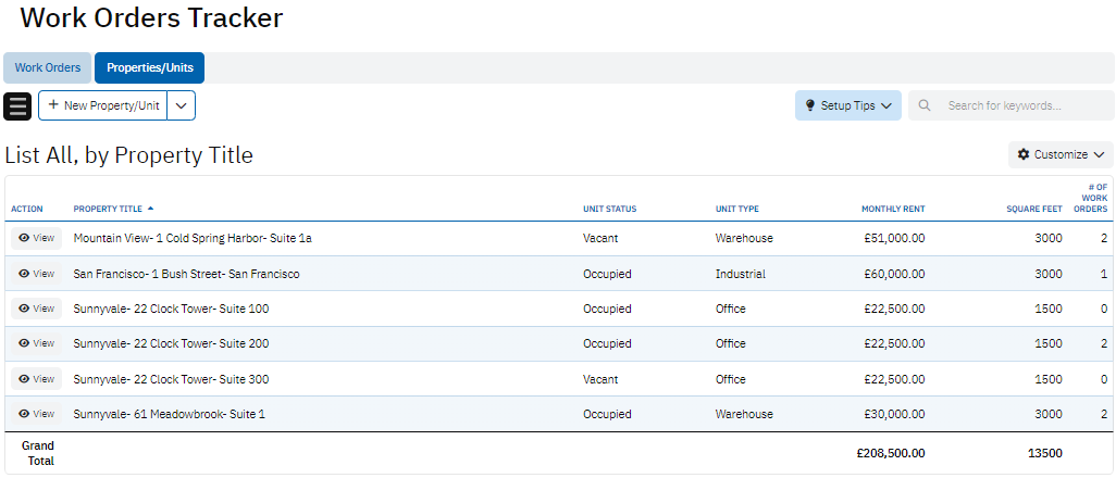 The Properties/Units table provides detailed information about each property or unit where work orders may be requested. It includes fields such as Property/Unit #, Property Title, and Address to identify and locate the property. The table also tracks Unit Status, Monthly Rent, and Square Feet, which are important for understanding the characteristics and condition of each unit. This table helps in associating work orders with specific properties and managing property-related details effectively.